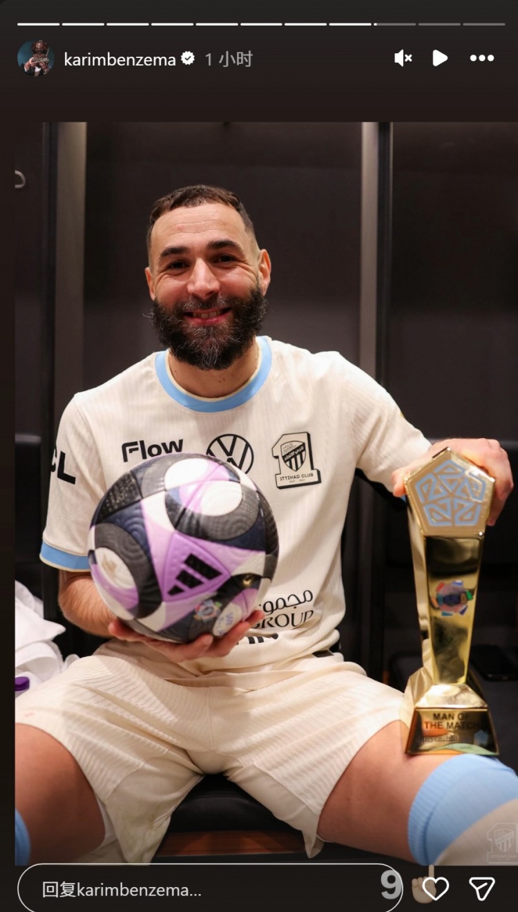 本泽马赛后更新社媒动态,晒出与比赛用球、全场最佳球员奖杯的合照,庆祝戴帽。